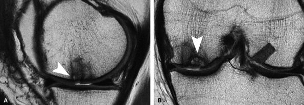 FIGURE 7.29 ● Sagittal (A) and coronal (B) fast spin-echo MR images of the knee in a 41-year-old patient obtained 3 months following autologous osteochondral transfer using multiple plugs. There is overall good bony incorporation of the osteochondral plugs, but with focal cystic change and collapse of subchondral bone centrally (arrowhead in A and B). Note that the donor site (B) over the lateral aspect of the intercondylar notch is filled with hyperintense material, likely representing reparative fibrocartilage.