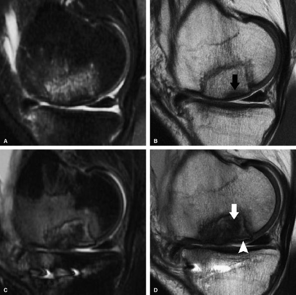 FIGURE 7.30 ● Sagittal inversion recovery (A) and fast spin-echo (B) MR images of the knee in a 36-year-old patient performed 1 year following fresh-frozen allograft transplantation in the medial femoral condyle. The allograft is slightly proud with persistent bone marrow edema pattern, both within the graft and at the graft-host interface, associated with mild subchondral collapse (black arrow in B). Corresponding inversion recovery (C) and fast spin-echo (D) MR images obtained a year and a half later, with interval tibial osteotomy, demonstrate further collapse of the allograft bone, with the areas suspicious for the presence of nonviable bone (white arrow), which is of low signal intensity on both pulse sequences. Note also the fluid imbibition (arrowhead in D) beneath the graft subchondral plate.