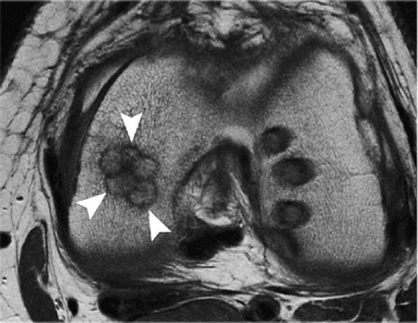 FIGURE 7.31 ● Axial fast spin-echo MR image of the knee performed 3 months following autologous osteochondral transfer using multiple plugs to restore a large osteochondral defect of the medial femoral condyle. Note consolidation of trabeculae (linear low signal intensity) around the plugs (arrowheads) as a result of the “press fit” fixation. Donor sites are seen in the lateral femoral condyle, close to the notch.