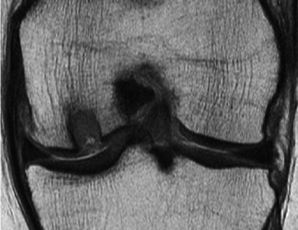 FIGURE 7.32 ● Coronal fast spin-echo MR image of the knee in a 61-year-old patient obtained 3 months following placement of a synthetic scaffold bone graft substitute. Note the intermediate signal intensity characteristics of the synthetic plug.