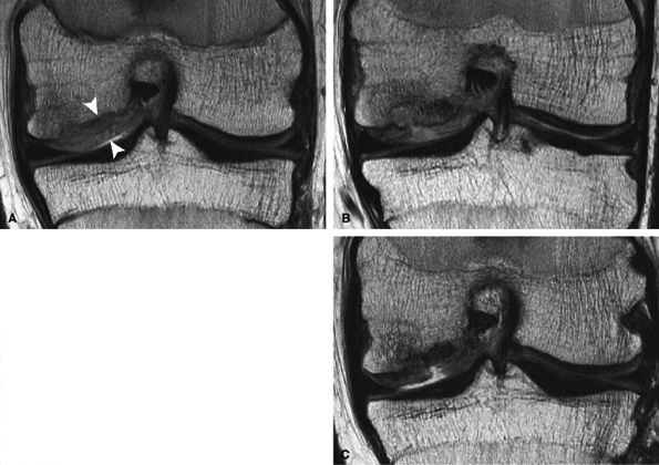FIGURE 7.33 ● Coronal fast spin-echo MR images of the knee in a 15-year-old boy obtained following ACI for osteochondritis dissecans of the medial femoral condyle. (A) At the 3-month follow-up, the repair cartilage is proud and hyperintense relative to native cartilage, consistent with graft hypertrophy (arrowheads). (Reprinted by permission of