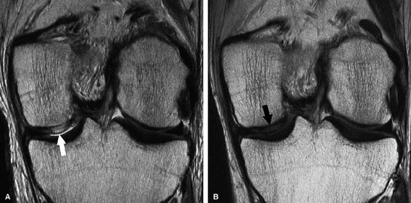 FIGURE 7.34 ● Coronal fast spin-echo MR images of the knee in a 31-year-old man obtained following ACI. (A) Six weeks following surgery the graft is hyperintense relative to the intact, hypointense overlying periosteal cover (arrow). (B) Twenty months following surgery there is incorporation of periosteum to what is now isointense reparative cartilage, such that periosteal cover is no longer distinct (arrow). (Reprinted by permission of