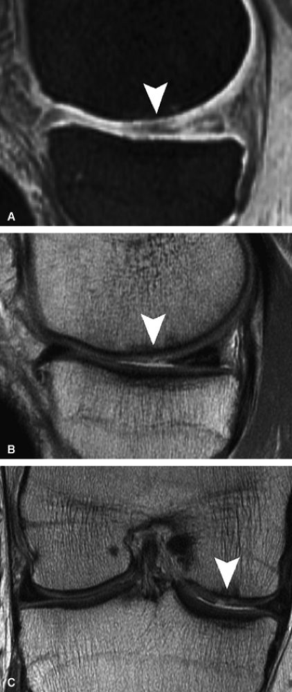 FIGURE 7.6 ● (A) Sagittal fat-suppressed T1-weighted gradient-echo MR image sequence of the knee demonstrates a focal high-grade partial-thickness cartilage defect overlying the medial femoral condyle (arrowheads). In the equivalent time required to acquire this single pulse sequence, cartilage-sensitive fast spin-echo MR sequences in two planes—sagittal (B) and coronal (C)—can be obtained, in which the depth of the lesion is much better delineated. (Reprinted by permission of SAGE Publications, Inc., from Am J Sports Med, in press.)