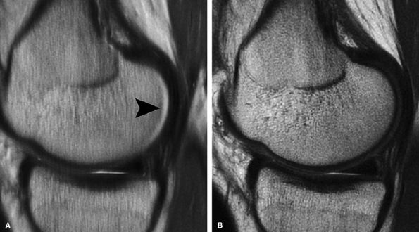 FIGURE 7.7 ● Sagittal fast spin-echo MR images of the knee in a 28-year-old man performed on a high-field system (3 Tesla). (A) There is chemical shift misregistration and image blurring at a receiver bandwidth of 10 kHz (arrowhead). (B) Corresponding image acquisition with all parameters held the same except for the use of a wider receiver bandwidth of 62.5 kHz. Attention to imaging technique is imperative to provide reproducible cartilage imaging.