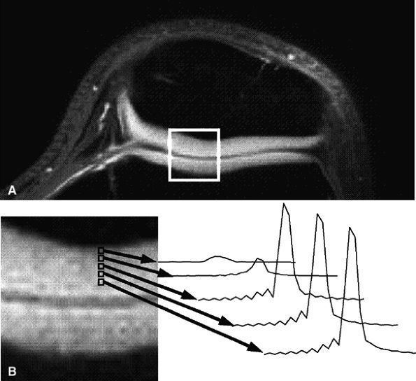 Short echo time projection reconstruction imaging of cartilage is a technique to detect ultrashort species in cartilage, potentially improving visualization of cartilage structure.47 Gold et al. described a method to obtain information from ultrashort echo time species in cartilage using projection-reconstruction spectroscopic imaging, disclosing spectra from voxels across the zones of articular cartilage that are reconstructed at the water frequency (Fig. 7.8).48 The latter technique also uses fat suppression to minimize chemical shift misregistration.