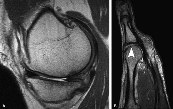 FIGURE 7.9 ● Fast spin-echo MR images obtained in a 0.7-Tesla open unit. (A) Sagittal image of the knee in a 40-year-old patient demonstrates a chronic tear of the posterior horn of the medial meniscus, full-thickness cartilage loss, and sclerotic changes in the subchondral bone over the medial compartment. (B) Sagittal image of the forefoot in a 48-year-old patient demonstrates active cartilage delamination (arrowhead) and flap formation over the head of the second metatarsal.