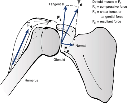 Figure 16-2 Example of force decomposition in the shoulder joint. The deltoid force, Fd, is represented (decomposed) as a compressive force, Fc, and a shearing or tangential force, Fs. (Adapted from Buckwalter JA, Einhorn TA, Simon SR, eds. Orthopaedic Basic Sciences, 2nd ed. Chicago: American Academy of Orthopaedic Surgeons, 2000.)P.368