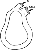 The glenoid labrum. Its peripheral margin is attached to the rim of the glenoid fossa. While both the tendon of the long head of the biceps muscle (B) and the superior glenohumeral ligament (SGHL) appear to arise from the superior margin of the labrum, the biceps tendon also has a bony attachment. (Adapted from Harryman DT et al. The Role of the Rotator Interval in Passive Motion and Stability of the Shoulder. J Bone Joint Surg Am 1992;74:53, with permission.)  |