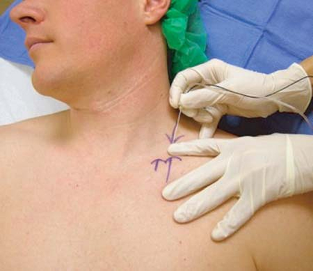 injected with repeated aspiration for blood every 5 mL to be distributed around the brachial plexus (Fig. 7-3).