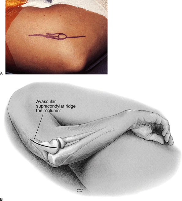 If a simple “column” release is anticipated a limited incision measuring 6 to 8 cm in length is made over the lateral column, ending 2 cm distal to the lateral epicondyle as shown in this right elbow. |
