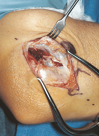 In those instances in which there is also loss of flexion, the triceps is elevated from the posterolateral column and the posterior capsule is also excised. If an osteophyte is present, it is removed with an osteotome. |