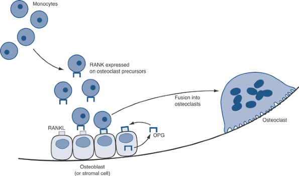 c-fms receptor) become osteoclast precursors. These cells bind RANKL on