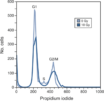 Analysis of the cell cycle using flow cytometry. Cells that have been stained with propidium iodide can be classified into three populations—G1, S, and G2/M—based on the amount of DNA that they contain. Treatment with X-irradiation (10 Gy in this example) decreases the G1 fraction and promotes the build-up of cells in G2/M. Note also the appearance of a large spike to the left of the G1 peak; this spike (known as sub-G1) represents cells with reduced DNA content, likely the result of either apoptosis or necrosis (see later). |