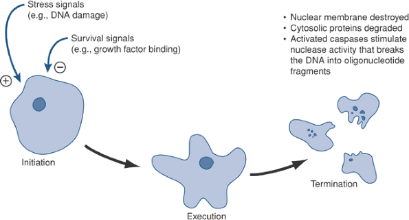 Key steps in apoptosis. The healthy cell needs to be stimulated by