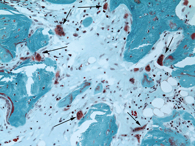 Figure 13-8 Large, multinucleated osteoclasts (arrows) attached to and resorbing bone. Modified Masson-Goldner trichrome stain, 200 × original magnification.