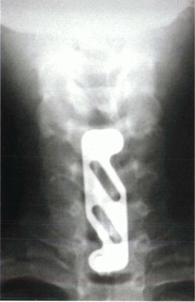 Anteroposterior radiograph after a three-level anterior cervical discectomy and fusion with tricortical grafts for multiple-level herniations. The anterior plate assists with stability and improves fusion rates, especially in multiple-level operations. |