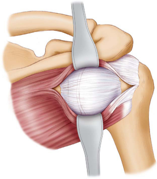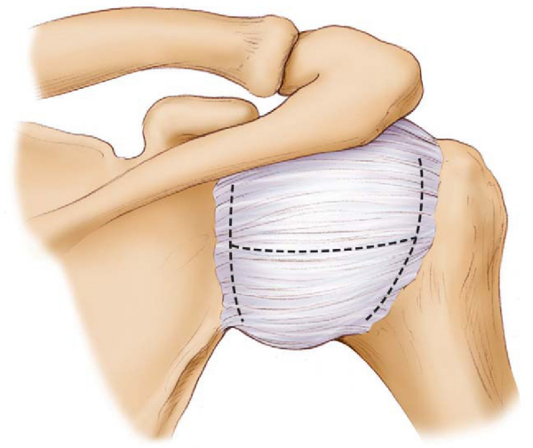 Once the capsule is completely defined, a horizontal incision centered over the middle of the joint is made from the glenoid extending laterally. A vertical incision is made just lateral to the capsular attachment to the glenoid to make a T-shaped pattern and two mobile flaps of capsule (