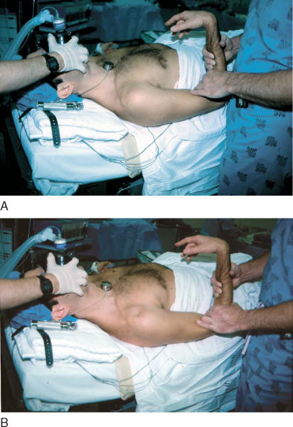 A thorough examination under anesthesia is performed to document motion and direction of instability before surgical stabilization. In addition to a general shoulder examination, an assessment of the degree of capsular redundancy can be accomplished by the sulcus test. This is performed by applying downward traction to the adducted arm (see
