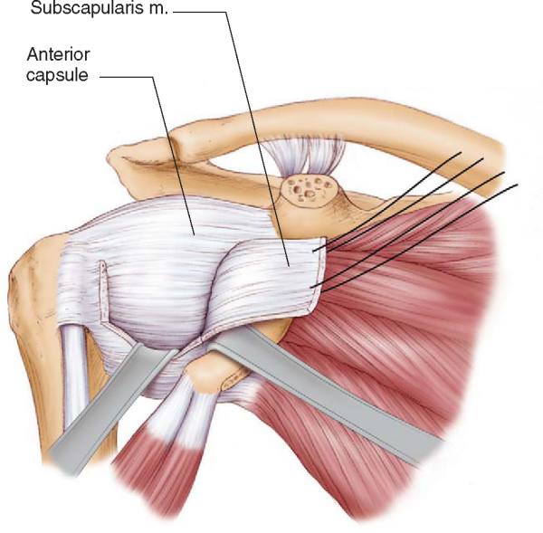 An excellent exposure of the anterior shoulder is obtained once the coracoid has been osteotomized. The superior half of the subscapularis tendon is detached distally from just medial to the biceps tendon while preserving the underlying capsule (