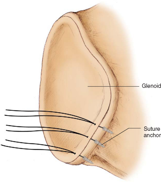 The anterior glenoid neck and rim are prepared as the recipient bone bed for grafting by use of curets and high-speed bur (a light dusting). The goal here is to establish a bleeding bone surface devoid of fibrous tissue while removing as little bone structure as possible. Three suture anchors (3.0 mm Bio-Suture Tak; Arthrex, Naples, Fla) are placed at the native glenoid rim at the 3-, 4-, and 5-o’clock positions (right shoulder) and are used later for capsular repair (