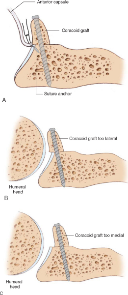 ). Minor graft rotation and trimming are performed as necessary for best fit. Proper positioning of the coracoid graft relative to the glenoid rim is critically important for success in preventing recurrent dislocation and for the avoidance of late degenerative arthritis (