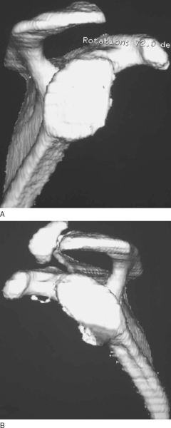 Preoperative radiographs give valuable information about various areas of bone deficiency. However, quantification of bone loss based on plain radiographs is difficult. Three-dimensional computed tomographic scans of bilateral shoulders have been extremely valuable in allowing accurate quantification of glenoid and humeral bone loss (see
