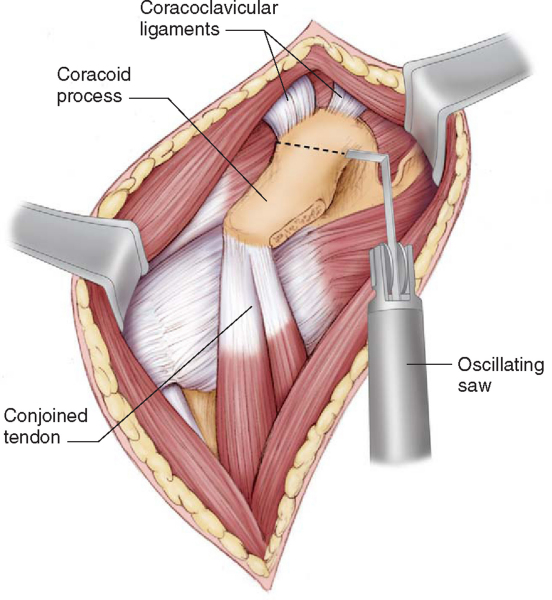 Next, a 70-degree angled sagittal saw blade is used to osteotomize the coracoid at its base, just distal to the insertion of the coracoclavicular ligaments (