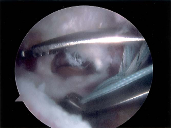 ). For larger tears, more anchors are placed as necessary. Suture anchors that are double loaded with two sutures are preferred.
