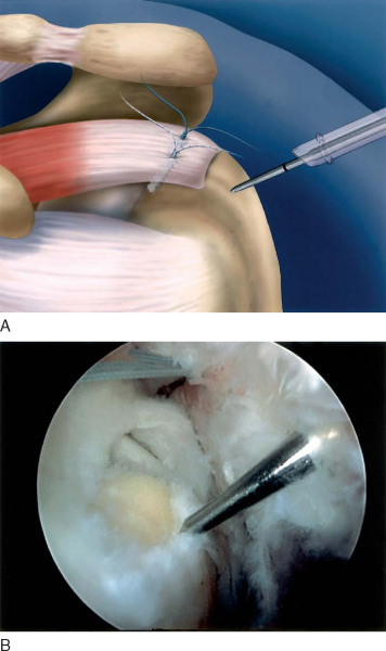 The greater tuberosity footprint is débrided with removal of soft tissue, and the cortical bone is abraded to stimulate healing. Decortication is avoided because it may compromise suture anchor fixation strength (see