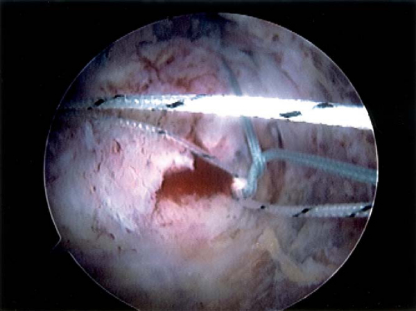 The persistent tear rate after open and arthroscopic rotator cuff repair is concerning [3] [4] [5] [6] [7] and has stimulated development of improved rotator cuff repair techniques. Arthroscopic repair techniques currently emphasize proper recognition of tear pattern, adequate mobilization of retracted tendons, restoration of the native insertional footprint, and adequate repair strength. The techniques for arthroscopic rotator cuff repair have evolved from single-row suture anchors to double rows of suture anchors in the greater tuberosity. Studies have also shown that transosseous tunnel repair techniques provide improved footprint coverage,[2] pressurized contact area at the footprint,[11] and reduced motion at the footprint tendon-bone interface.[1] It is believed that improved contact characteristics will help maximize healing potential between repaired tendons and the greater tuberosity. The most recent techniques developed in double-row rotator cuff repair now replicate transosseous tunnel techniques and create tissue compression against the tuberosity to enhance healing.[10] These new techniques have been referred to as suture bridge techniques.