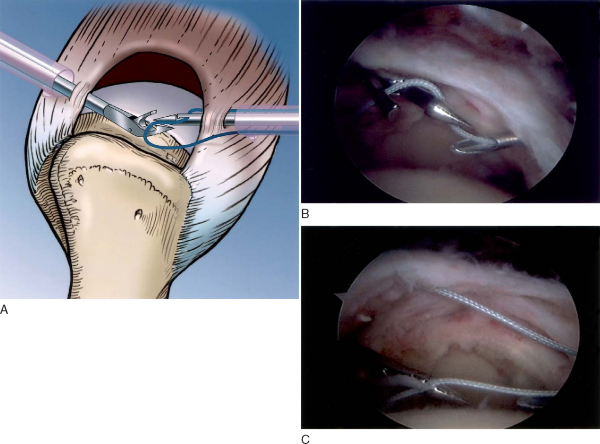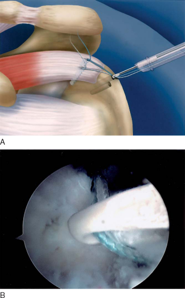 U- and L-shaped tears often have poor lateral mobility, and margin convergence sutures are necessary (Figs. 17-4 and 17-5 [4] [5]). While viewing from the lateral portal, free No. 2 sutures are passed through the anterior limb of rotator cuff and then the posterior limb to form a simple suture configuration (
