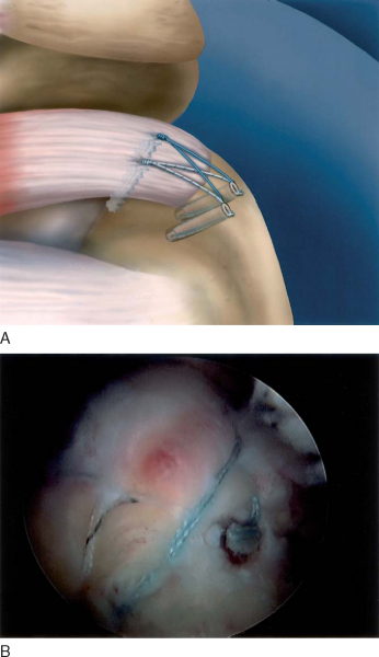 ). This maximizes the tendon available for contact with the footprint. The sutures are passed with the surgeon’s preferred suture-passing device. The second suture from the anchor, if it is double loaded, may also be placed as a second mattress suture.