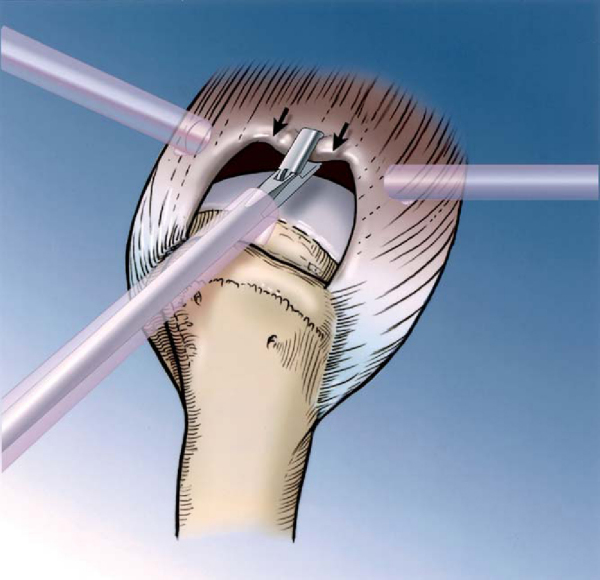 Examination under anesthesia confirms passive range of motion. Diagnostic arthroscopy is performed in a stepwise fashion to evaluate the following: