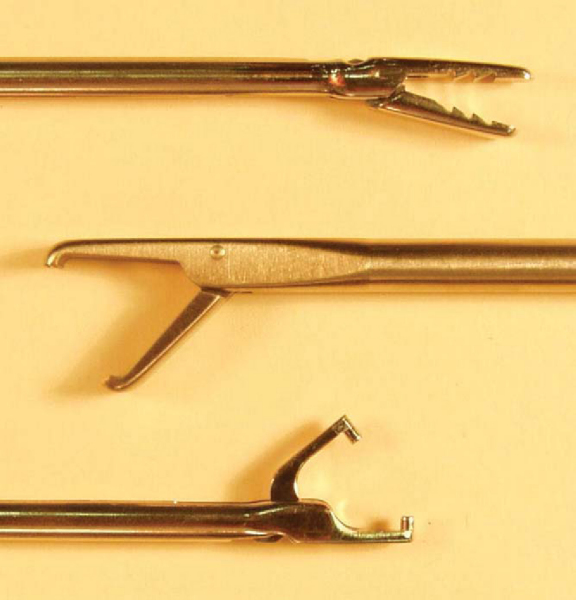 ). These devices have sharp, pointed ends and are used to grasp or to pass suture directly through tissue. Penetrators can be used in either a retrograde or antegrade fashion to push or to pull suture through tissue and are available with straight and angled tips. Particular care should be taken with these instruments to avoid iatrogenic injury to cartilage or more delicate labral tissue. Obtaining an ideal angle for suture passage can be difficult, and accessory portals should be made if needed to improve instrument orientation.
