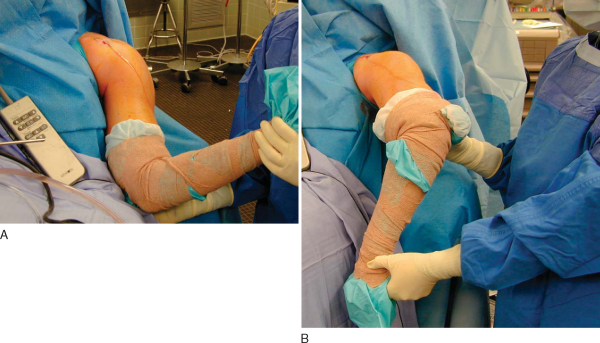 Finally, the shoulder is put through a gentle manipulation. A sequence of forward elevation in the plane of the scapula, external rotation at the side, abduction, and internal rotation is performed holding the proximal humerus, thus lowering the moment arm and decreasing the risk of a humerus fracture. A few soft releases may be felt, representing the last few contractures being lysed. This is not a true manipulation. The capsular release provides for a controlled, bloodless, atraumatic manipulation with this range of motion at the end of the procedure (