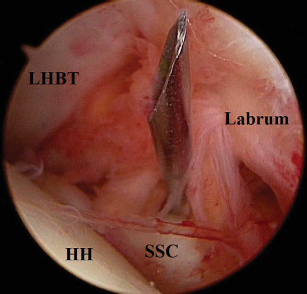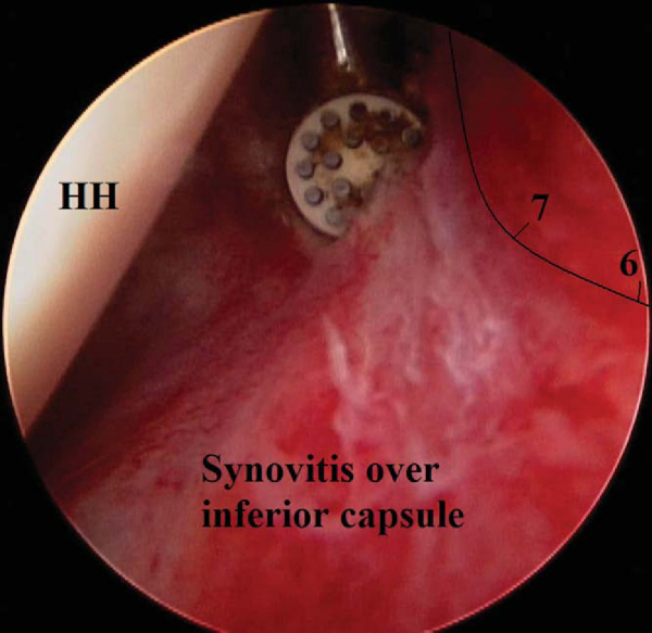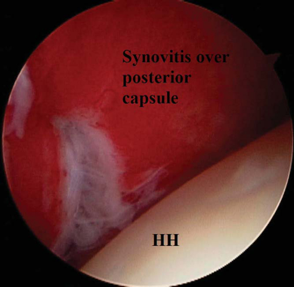The arthroscope is connected, and visualization of the arthroscopic triangle is achieved. The arthroscopic triangle formed by the long head of the biceps tendon, the glenoid, and the top of the subscapularis tendon is typically contracted and involved with a red, gelatinous synovitis (