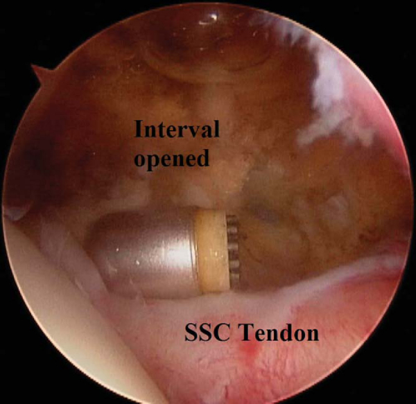 ). The region above the biceps origin, the posterosuperior recess, should be addressed and released if it is found to be contracted. This capsular area can restrict the excursion of the supraspinatus tendon unit.