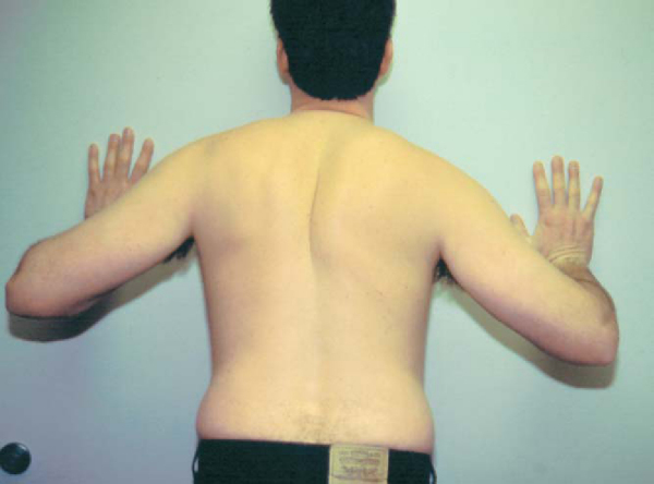 Winging of the scapula is a finding that may result from many causes. In athletes, winging is typically seen as an isolated palsy of the serratus due to a long thoracic nerve neurapraxic injury. Winging may also be seen with profound scapular bursitis or may manifest as part of scapular dyskinesis. Scapular dyskinesis is defined as abnormal motion of the scapula characterized by medial border or inferior angle prominence, early excessive scapular elevation and shrugging, or rapid downward rotation during lowering of the arm.[8] A static abnormality of scapular position, called the SICK scapula, probably represents a more severe state of this condition.[2] Whereas dyskinesis is likely to be the most common finding in the athlete with shoulder pain, it is best treated with appropriate rehabilitation and will not be explored in detail in this chapter. Winging due to bursitis typically resolves with treatment of bursitis. Winging due to long thoracic nerve injury resolves spontaneously in most athletes; when it persists, surgical intervention can be considered.
