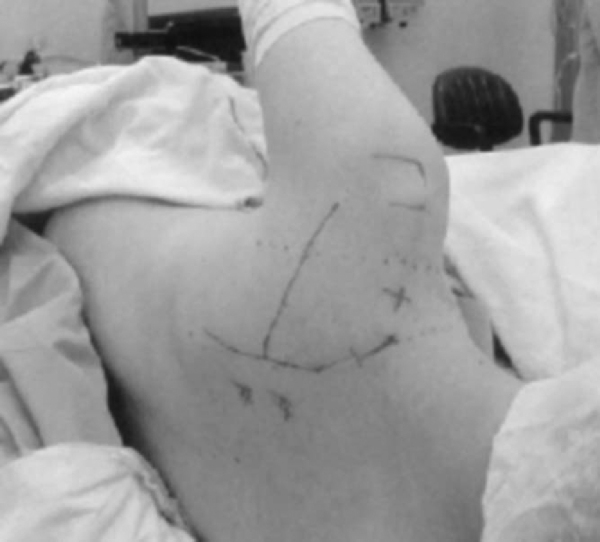 The incision is placed along the medial border of the scapula from the level of the scapular spine inferiorly to the superomedial angle (