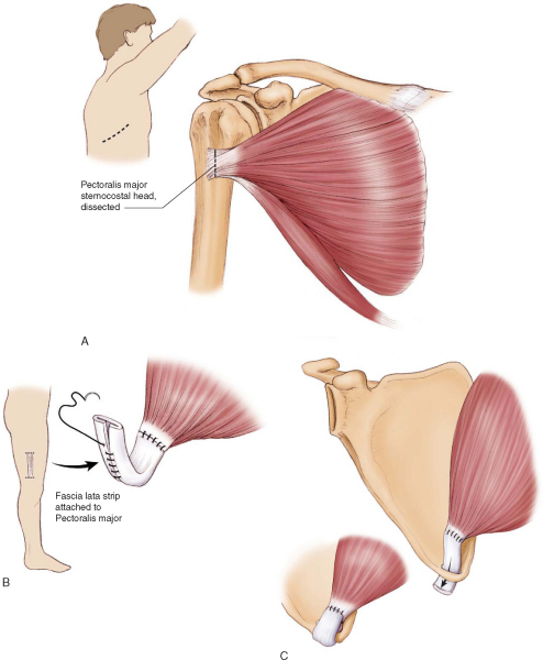 ). For this procedure, the patient is placed in the lateral decubitus position. Either one or two incisions can be used. For a single incision, it is made across the axilla from the border of the pectoralis major anteriorly to the inferior angle of the scapula. The sternocostal head lies under the clavicular head at the insertion into the humerus. The sternocostal head is released and redirected back toward the inferior tip of the scapula. Because this muscle alone is generally not long enough to reach without excessive tensioning, an autologous fascia lata or hamstring tendon graft from the ipsilateral leg is harvested. The fascia lata graft is tubularized and sewn into the end of the pectoralis major tendon. The distal tip of the scapula is then cleared of soft tissues, and a small hole is made in the tip. The fascia lata graft is then passed through the hole and sutured back onto itself. Enough tension is applied so that the end of the pectoralis tendon is in contact with the scapula.