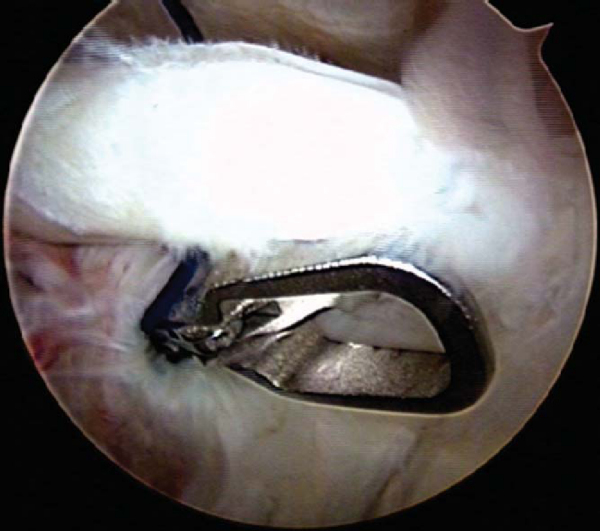 The biceps tendon is pushed into the humeral tunnel and secured in place by the advancing biotenodesis screw until the screw head is countersunk. The tunnel may be tapped before screw insertion if dense cortical bone is encountered. After screw insertion, the biceps tendon should be draped over and covering the tenodesis screw. A right-angled clamp can be used to elevate the biceps tendon to ensure complete seating of the screw.