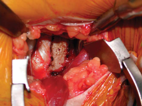The periosteum 1 cm proximal to the pectoralis major tendon is reflected sharply off the humerus, forming a rectangle measuring approximately 2 × 1 cm (