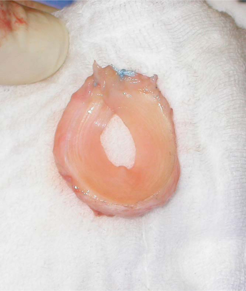 ). The degree of overlap is judged to allow the size of the prepared meniscus to approximate the size of the recipient glenoid. A Bankart awl or small drill bit is used to prepare the glenoid for transosseous sutures. A total of eight heavy, nonabsorbable sutures are used, starting at 12-o’clock and progressing in 90-minute intervals (