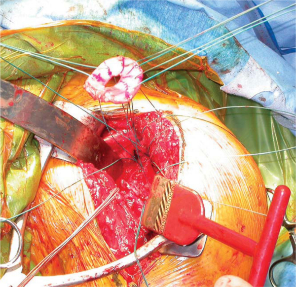 The humeral head protector is removed and replaced with the humeral trial. The subscapularis is reduced to its insertion, and soft tissue balance is assessed. The trial is then removed, and a series of four holes are drilled through the bicipital groove along the lateral edge of the lesser tuberosity footprint. A series of three holes are drilled medial to the footprint. Four No. 5 nonabsorbable sutures are then placed through the holes in horizontal fashion. The superior-most of these sutures will pass through a lateral drill hole and then around the neck of the implant rather than through a matching medial drill hole. The humeral implant is then inserted. A small amount of cement can be used along the proximal aspect of the implant, but given the future possibility of conversion to total shoulder arthroplasty, the humeral stem is not cemented in its entirety. The previously placed No. 5 sutures are then passed around the lesser tuberosity wafer and tied down securely (