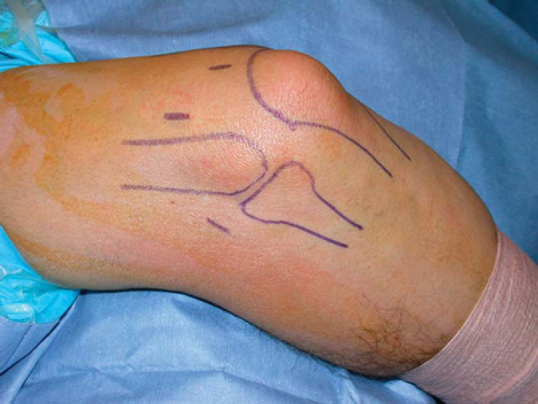 The patient is placed in either the supine or prone position, according to the surgeon’s preference for elbow arthroscopy (we prefer the prone position). The procedure can be performed under general anesthesia or regional block with simple sedation. However, some patients may not tolerate the prone position under sedation alone because of unrelated issues, such as shoulder pain in the ipsilateral or contralateral shoulder.