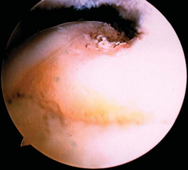 A routine diagnostic arthroscopy is performed. If any pathologic process is suspected in the ulnohumeral joint, a posterior portal is established to evaluate the ulnar and radial recesses. The radiocapitellar joint is evaluated for, among other entities, a soft tissue band or plica overriding the radius with pronation and supination, because this can be a cause of impingement. The lateral joint capsule and the insertion of the ECRB are assessed under direct vision. We prefer to grade ECRB involvement according to the grading suggested by Baker et al.[1]