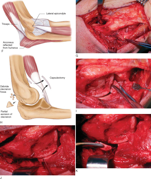 ). Capsular excision, fossae deepening, and coronoid and olecranon tip excision are as described for lateral capsulectomy.
