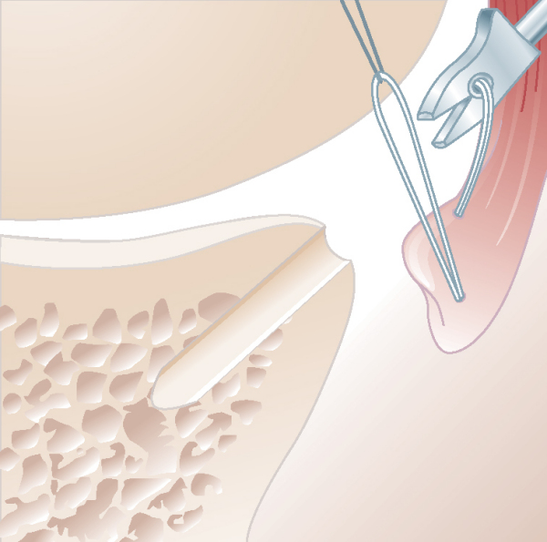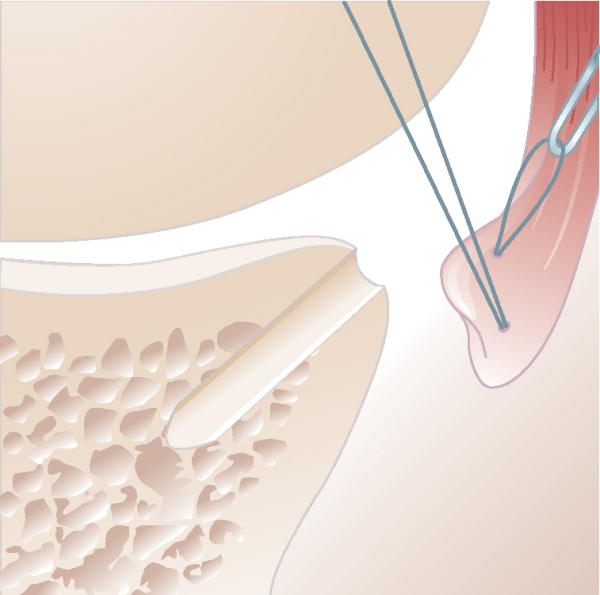 Depth of anchor insertion is determined by observing the ligament approximation to the glenoid and by intermittently pulling the utility loop to test the tension of the anchor loop during insertion. The anchor should not bottom out in the drill hole. Overtensioning can cause the anchor loop to tear through the ligament. Once this has been completed, the AIGHL is noted to shift superiorly and securely approximate to the glenoid rim in a low-profile manner (