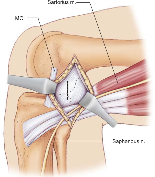 ). The posteromedial capsule can easily be palpated at the depth of the incision and a popliteal retractor placed at its posterior margin. The popliteal retractor separates the posteromedial capsule laterally from the saphenous nerve and pes tendons medially.