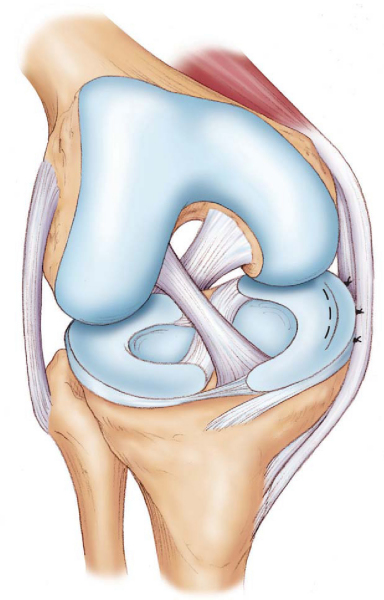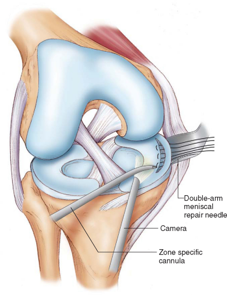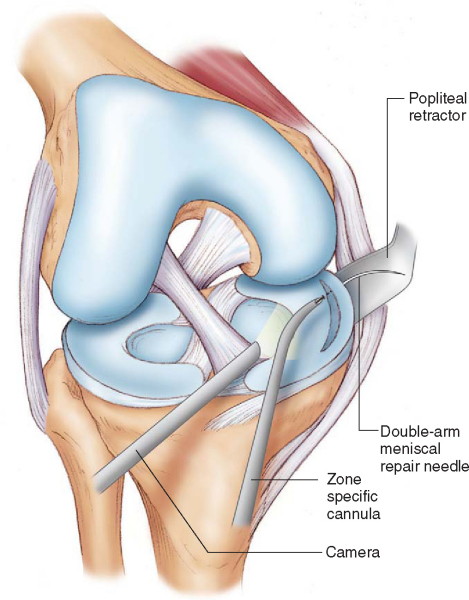 The meniscus functions to evenly distribute and transmit loads within the knee and provides secondary stability to tibial translation on the femur. Although Annandale[2] reported the first meniscus repair in 1885, it was nearly a century later that the practice of meniscal preservation became the standard. Fairbank[10] was the first to indirectly question the practice of complete meniscectomy and described the degenerative changes that result from its functional loss. Open repair, as popularized by DeHaven, [7] [8] was initially developed in an attempt to preserve meniscal function. The introduction of arthroscopic surgery soon led Henning[15] to advocate a combined arthroscopic and open technique, which involves small posteromedial and posterolateral incisions to receive sutures that are placed from within the joint. Many additional techniques have been described to repair the meniscus. [5] [16] However, the inside-out arthroscopically assisted technique is widely held as the standard with which other repair techniques are compared.
